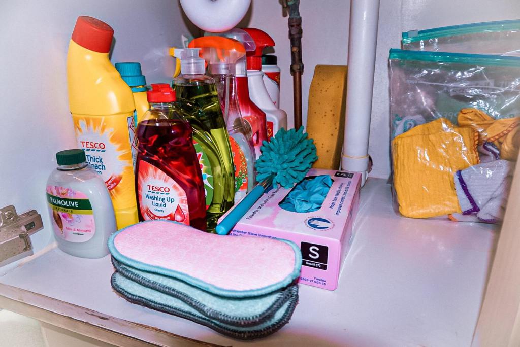 This is how I am currently storing all my cleaning products, not perfection but it will do – clean, organised and simple! Bathroom bits are upstairs in the bathroom in a cleaning caddy! ( I have not spent any money on storage for this cupboard as we were never going to be in this house for long) I love how the Zoflora bottles fit in the freezer bags it stops them leaking or falling over!